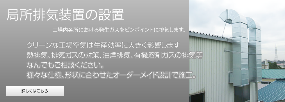 (株)吉田工業は、単に集塵・局所排気・換気設備を取り付けるだけではなく、 “お客様に一番必要なものを提供する”事を目的として、専門知識に基づいて分析を行い、設計、施工からメンテナンスまで、皆様の大切な営業ツールである工場の環境を守るお手伝いをさせていただきます。