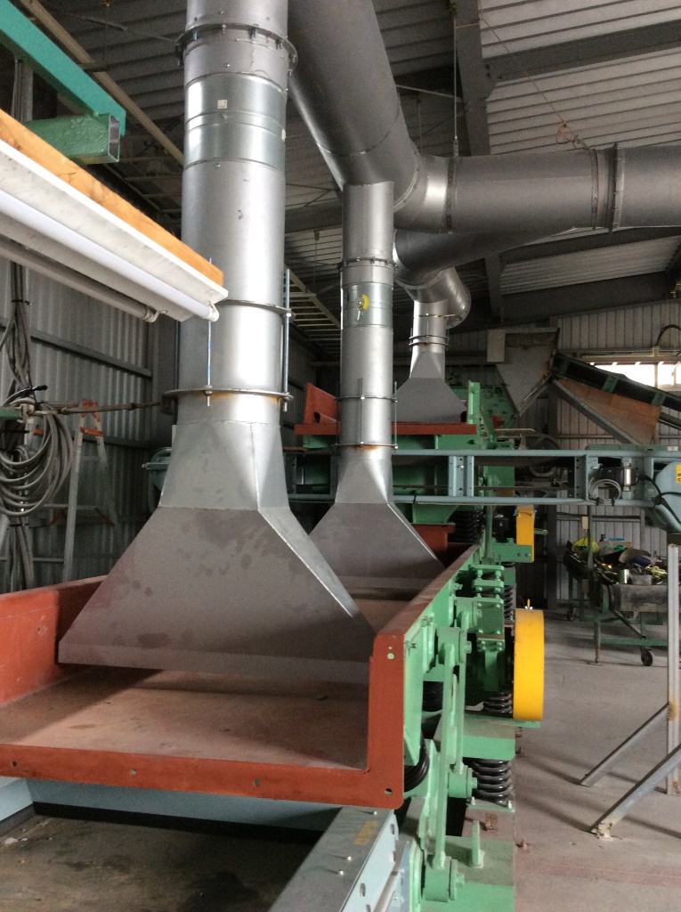 ↑ 振動コンベア上部に吸引フードを数箇所設けます