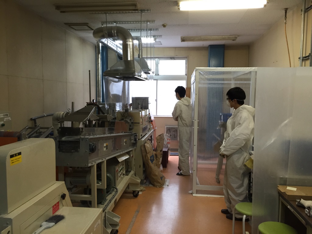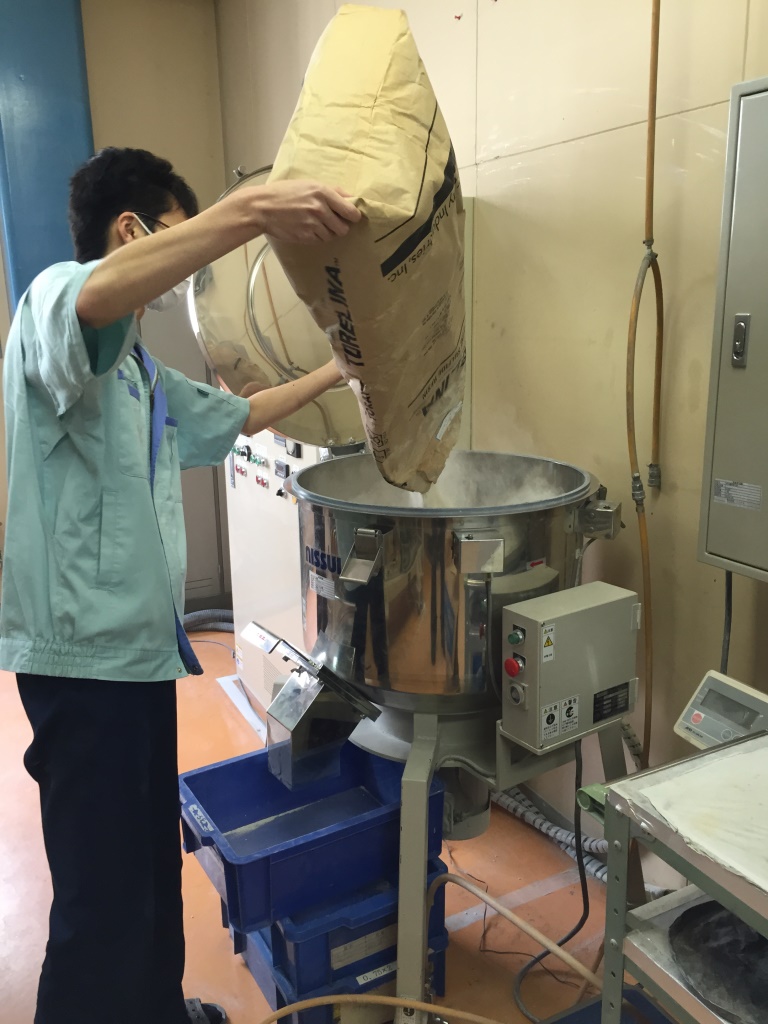 ↑ 攪拌機も粉が舞うので大変              ↑周りに飛散しないように囲い、効率良く集塵