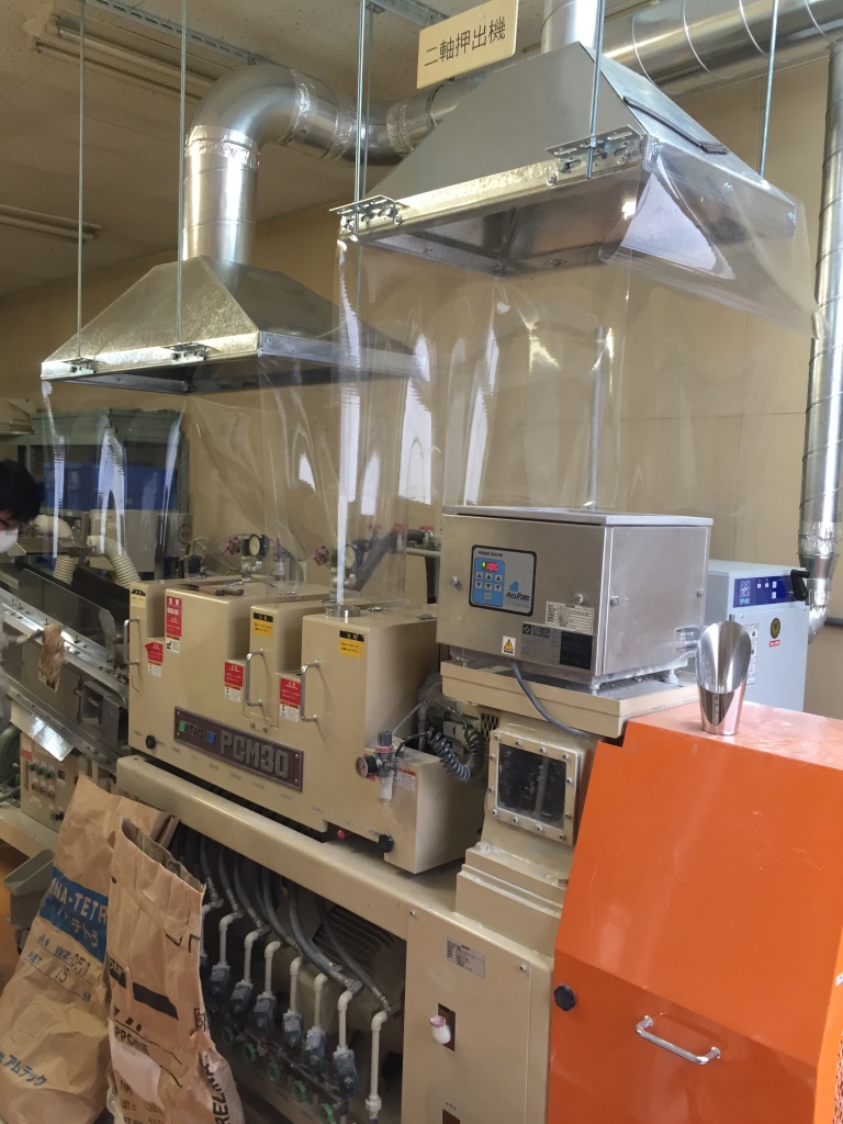 ↑ 写真左側が成型機。熱をかけると煙が充満してしまう   ↑吸引フードを上部に設け、効率良く排気