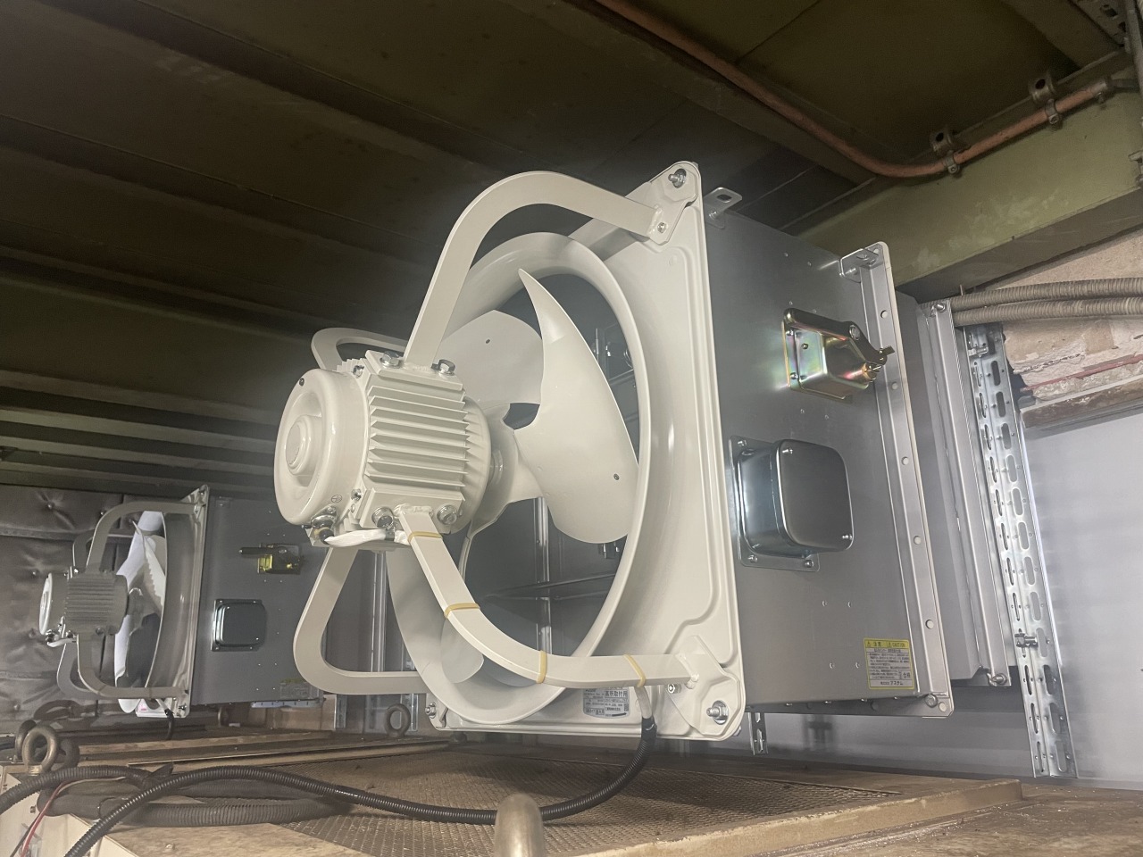 ↑屋内負荷装置側換気扇の様子。今回防火ダンパーの取付も行いました。