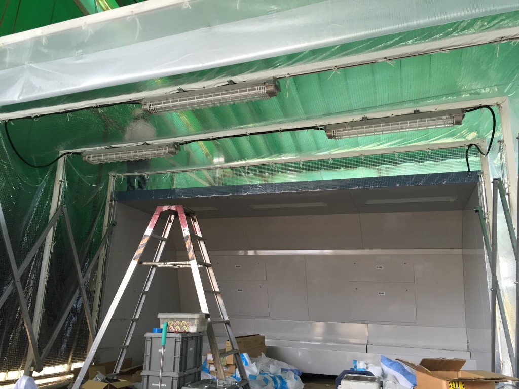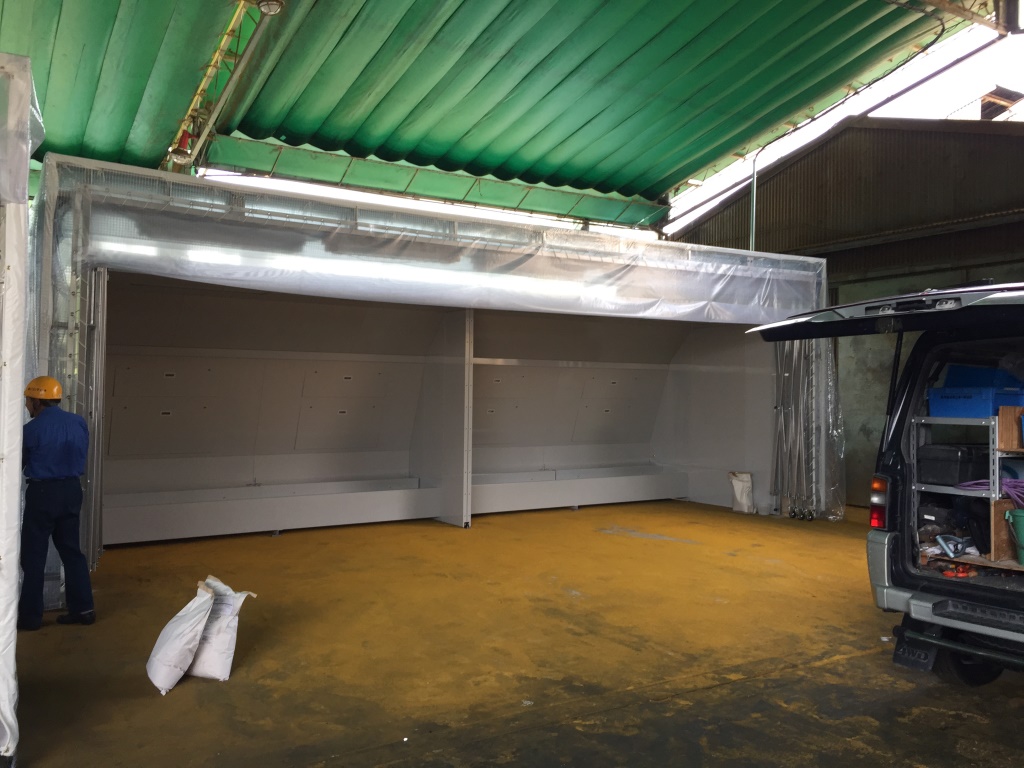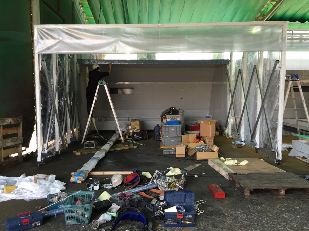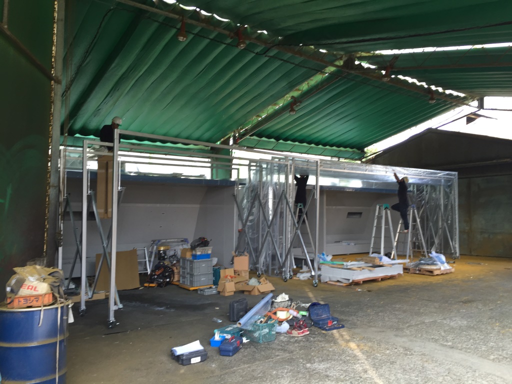 ↑ 塗装ブース前に折り畳みできるジャバラ式テントの設置です。