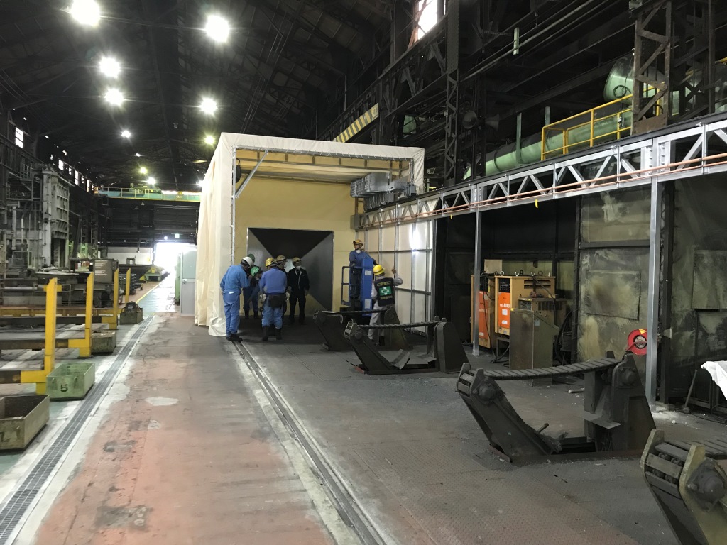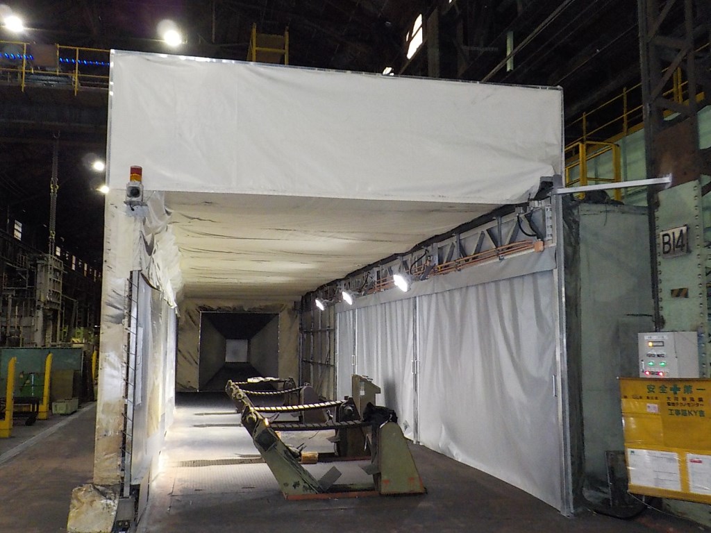 今回のジャバラ(伸縮)テントは前例の無い挑戦的なものでした。協力業者の方々のおかげで、また一つ弊社にとってかけがえの無い施工事例ができました。弊社ではさまざまな状況に応じて、さまざまは形状・寸法の装置を御提案できます。